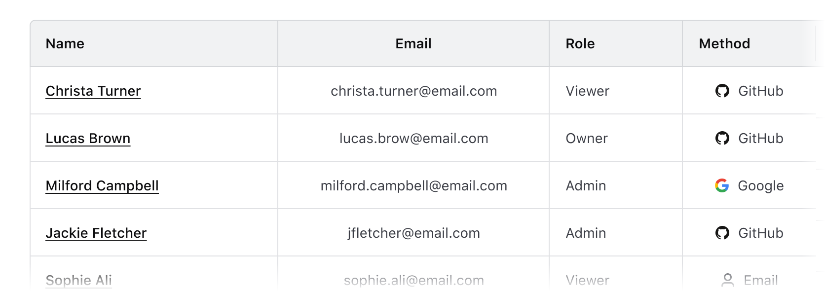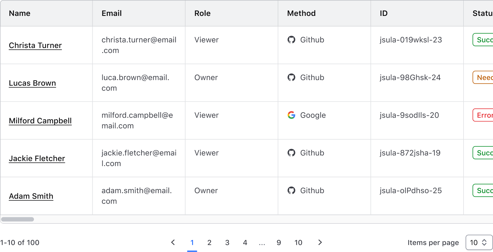 Unlike the Table component, Advanced Table supports keyboard navigation with focus states for each cell. For any other interactions, you must use interactive elements (buttons, links, etc.) within the cells.